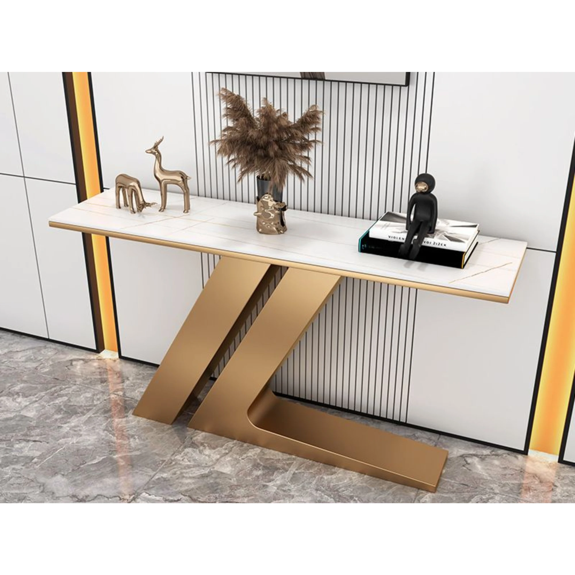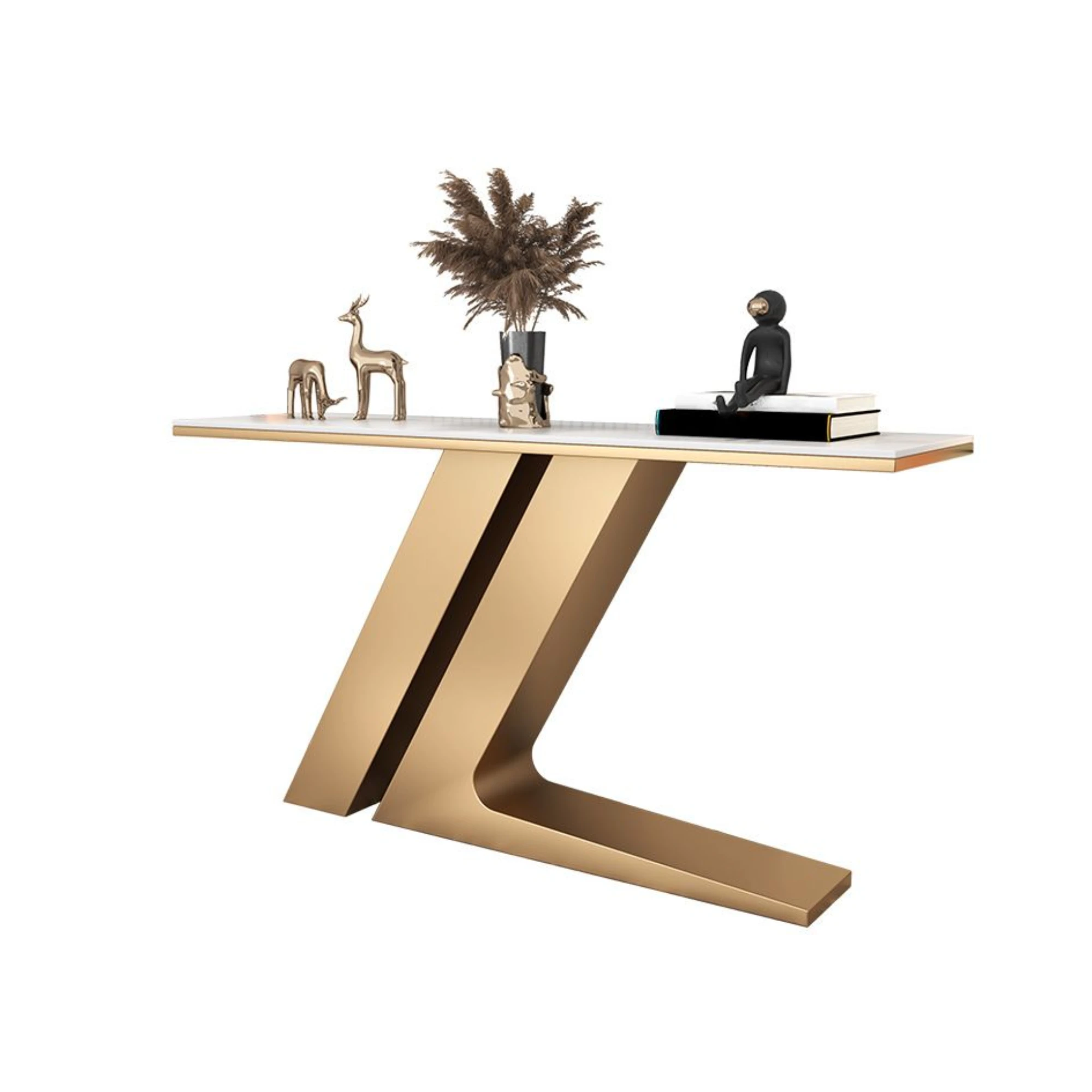 Make a bold statement in your entryway or living space with this ultra-modern console table. Featuring a sleek faux marble top and a striking gold Z-shaped base, this table blends glamour with contemporary design. The smooth surface offers plenty of space to display decorative accents, while the sculptural base adds architectural flair to any room. Perfect for hallways, foyers, or behind a sofa, this table effortlessly elevates your décor with a luxe, modern edge.