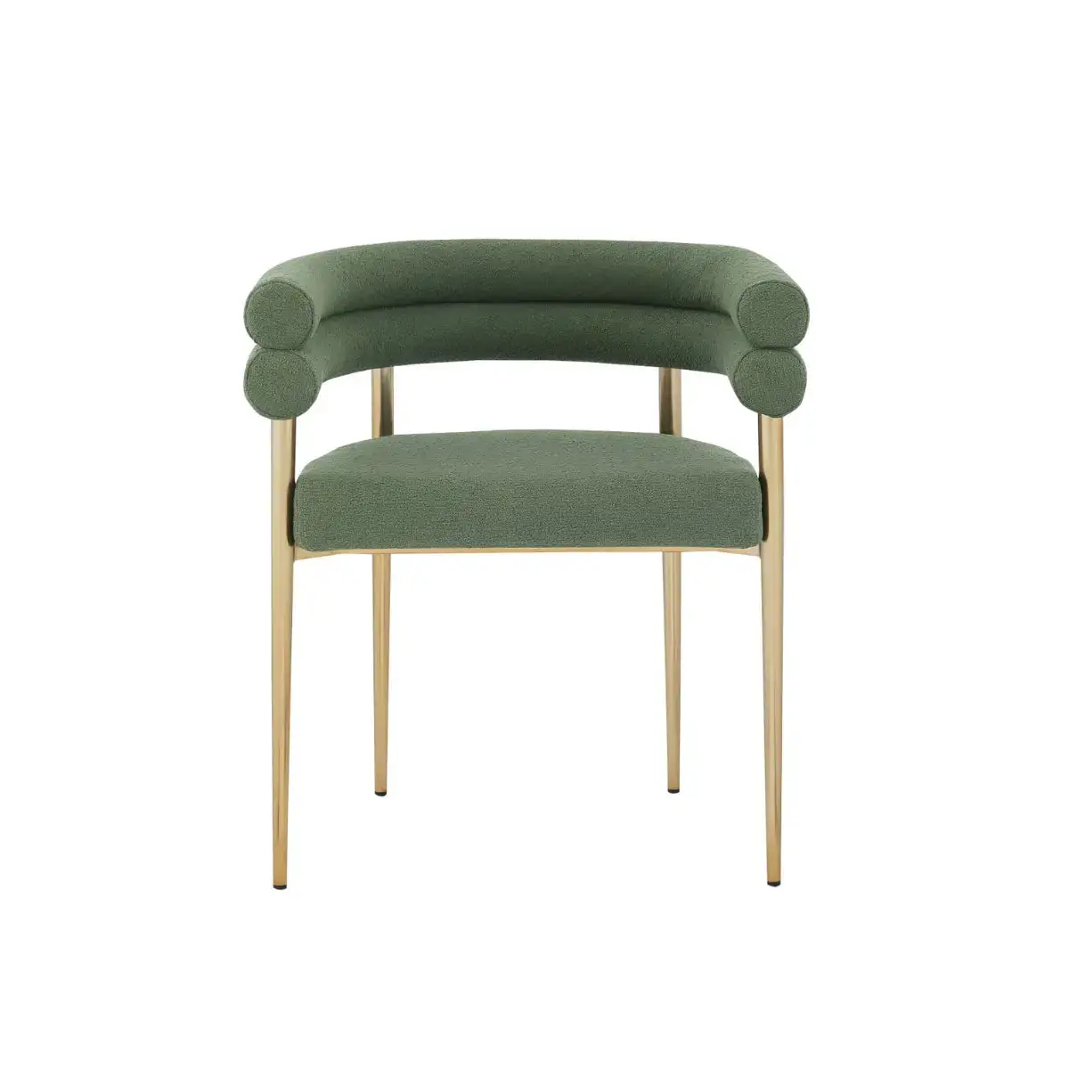 Enhance your dining space with theses exquisite Allure Dining Chairs. This captivating ensemble consists of two dining chairs, radiating contemporary styling that effortlessly blends with most existing interior decors. The plush seating invites you to indulge in luxurious comfort, while the premium fabric cover adds a touch of elegance to the overall design. Adorned with a mesmerizing green hue, these chairs create a visually stunning contrast against the opulent gold-finished metal frames. Every detail of these chairs exudes sophistication, making them the perfect addition to elevate your dining experience to new heights.