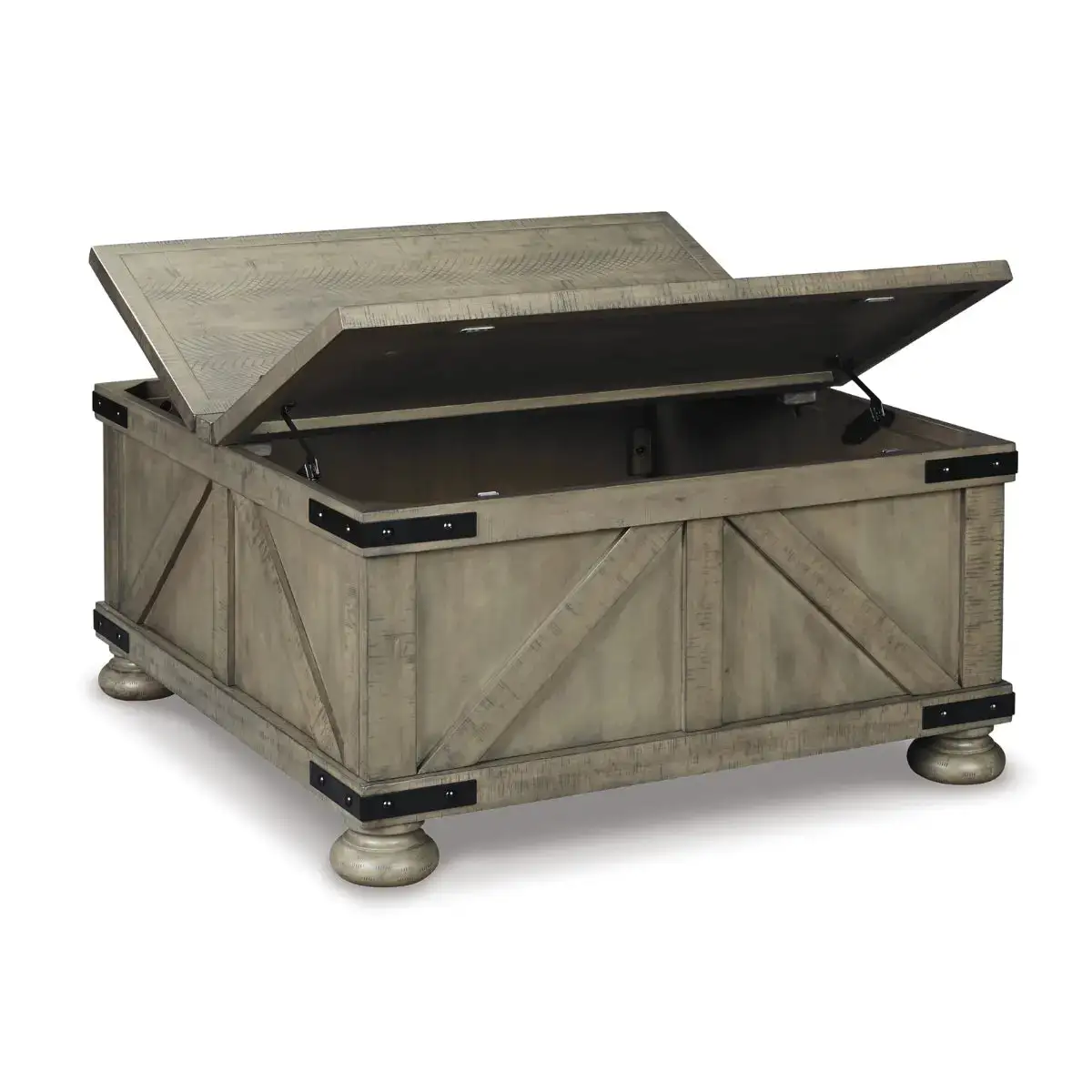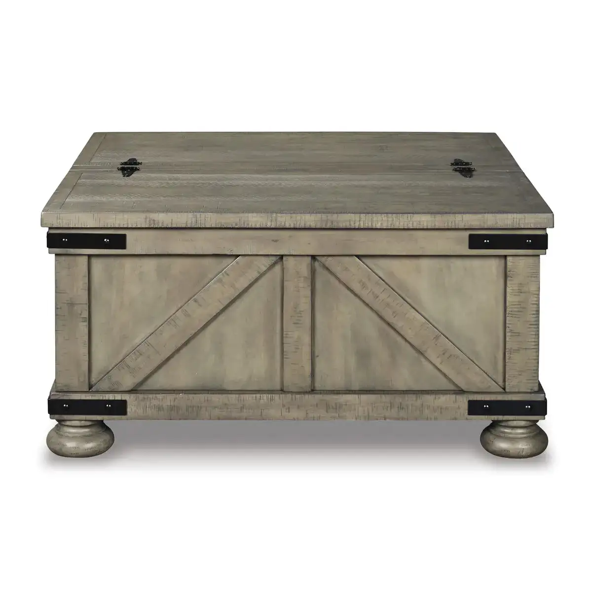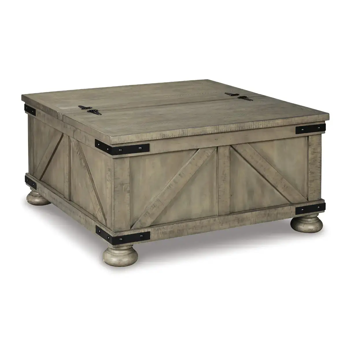 Double up on form and function with this square coffee table with storage. Its dual lid tabletop provides easy access to the roomy storage space. Crafted with solid pine wood treated to a weathered gray finish, this generously scaled coffee table is rustic farmhouse living at its best.