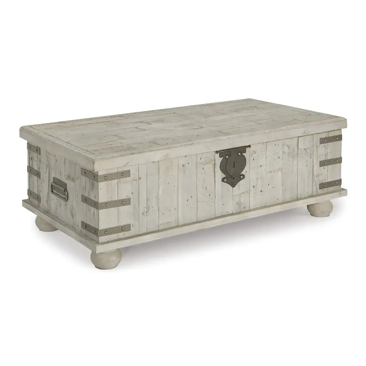 Unlock a quaint touch of farmhouse style and convenience in your living area with this lift top coffee table. Its design is inspired by the rugged looks of an antique storage trunk. Metal keyhole and bracket accents with rivets, a planked effect and large recessed bun feet dress up this charming piece. The distressed light gray finish enhances the reclaimed wood's natural grain, which delivers a naturally aged feel. You’ll love its generous scale, offering a roomy top that's ideal for displaying accents and more. Lift the top and enjoy the accommodating work or dining surface. Under the lift top, there's a fully finished storage area—deeply spacious for organization.