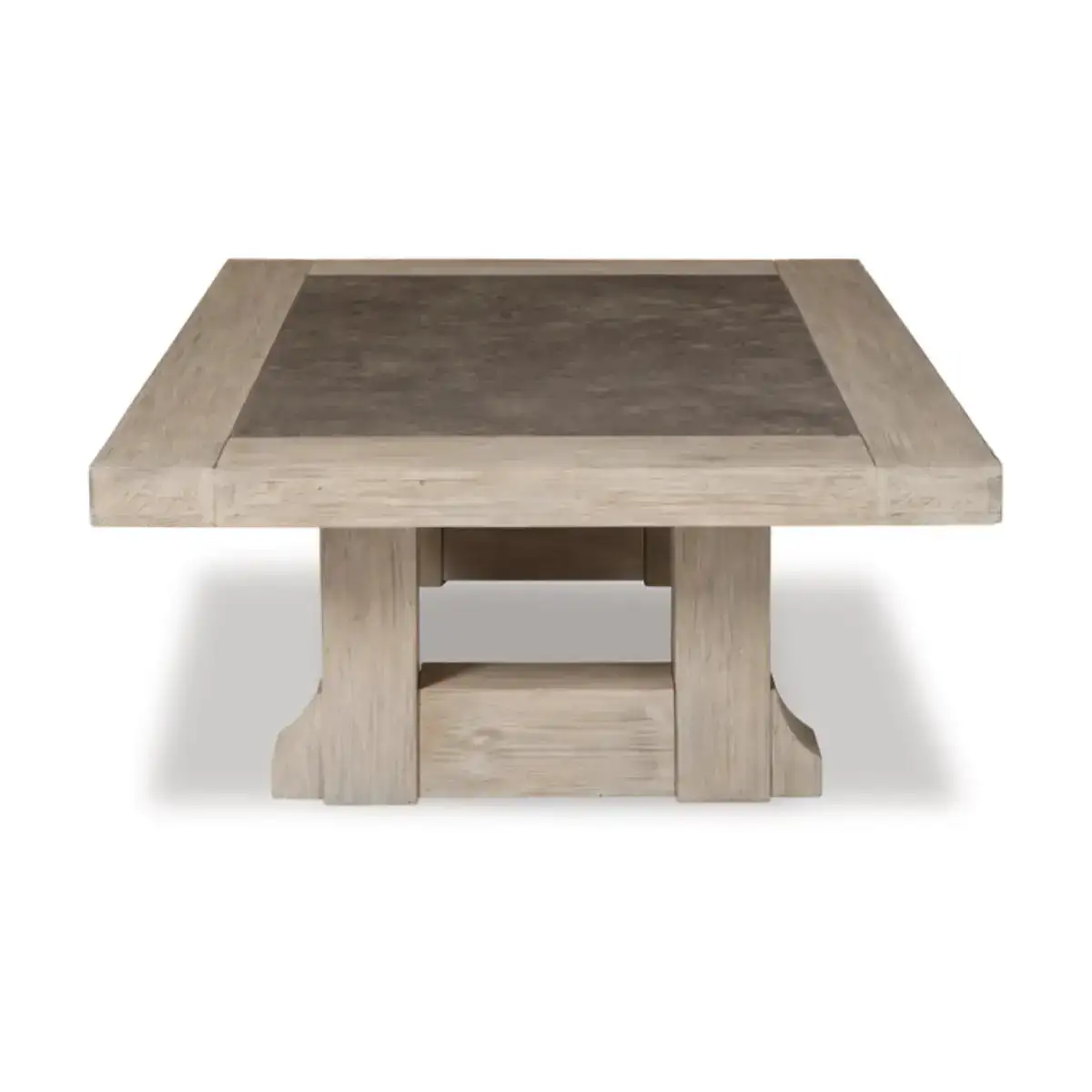 A striking example of rustic refinement, this coffee table is generously scaled to accommodate your entertainment needs with ease. Made with pine wood and veneer beautified with a complex bisque finish, this designer coffee table includes a top with MEGA-TUFF® melamine inset for mixed-media interest.