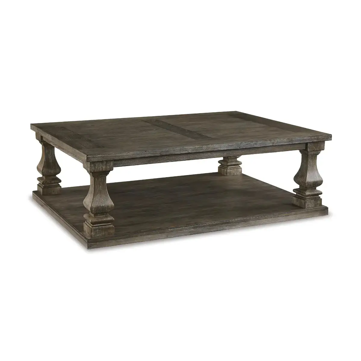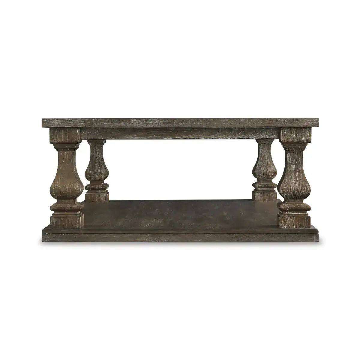 Homey. Hearty. Heavenly hued. Luring with a distressed weathered gray finish and square baluster legs set on a broad lower shelf for great presence, this coffee table is sure to make your homestead feel that much more like home. The look is beautified with elm veneers and a framed and plank-effect tabletop for a richly crafted masterpiece made for years of satisfaction.