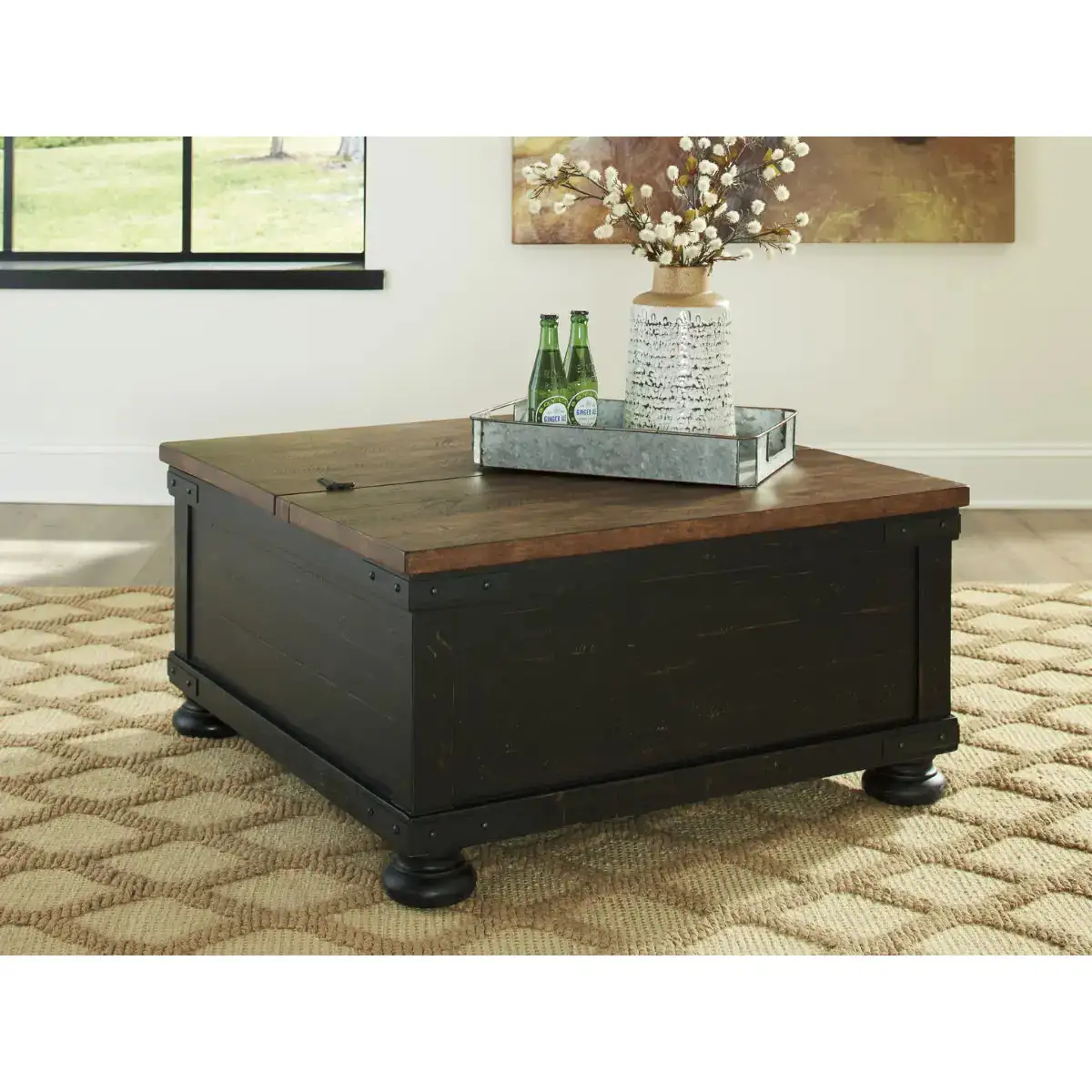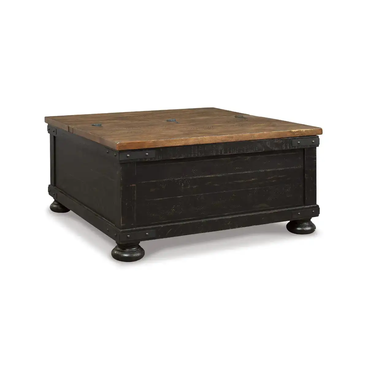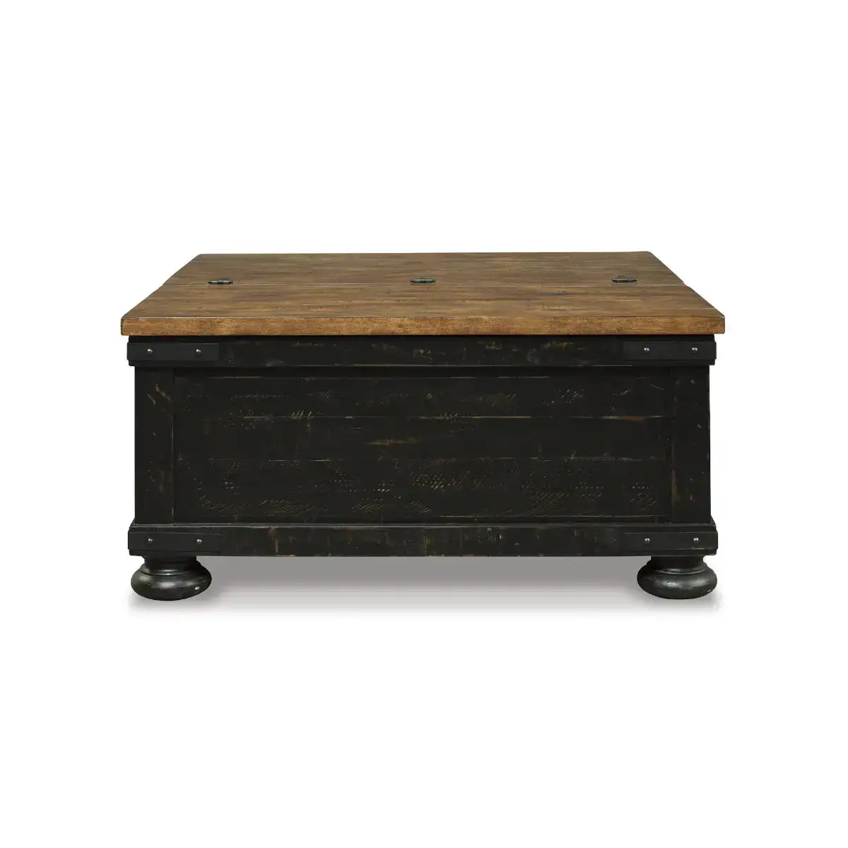 To those with an eye for the best in rustic farmhouse living, this two-tone square coffee table doubles up on form and function. Clever split style design pairs a spring lift top with hinged lid revealing a handy storage compartment. Designer touches include plank-effect styling, distress marks and industrial brackets for added character.