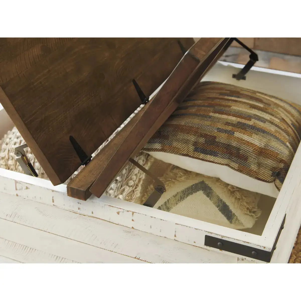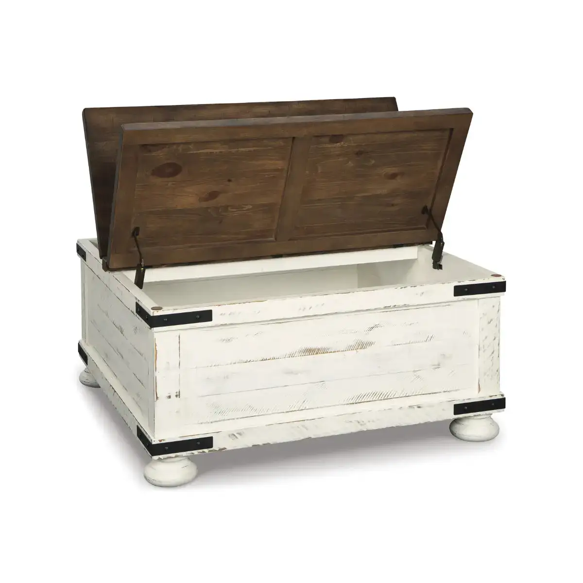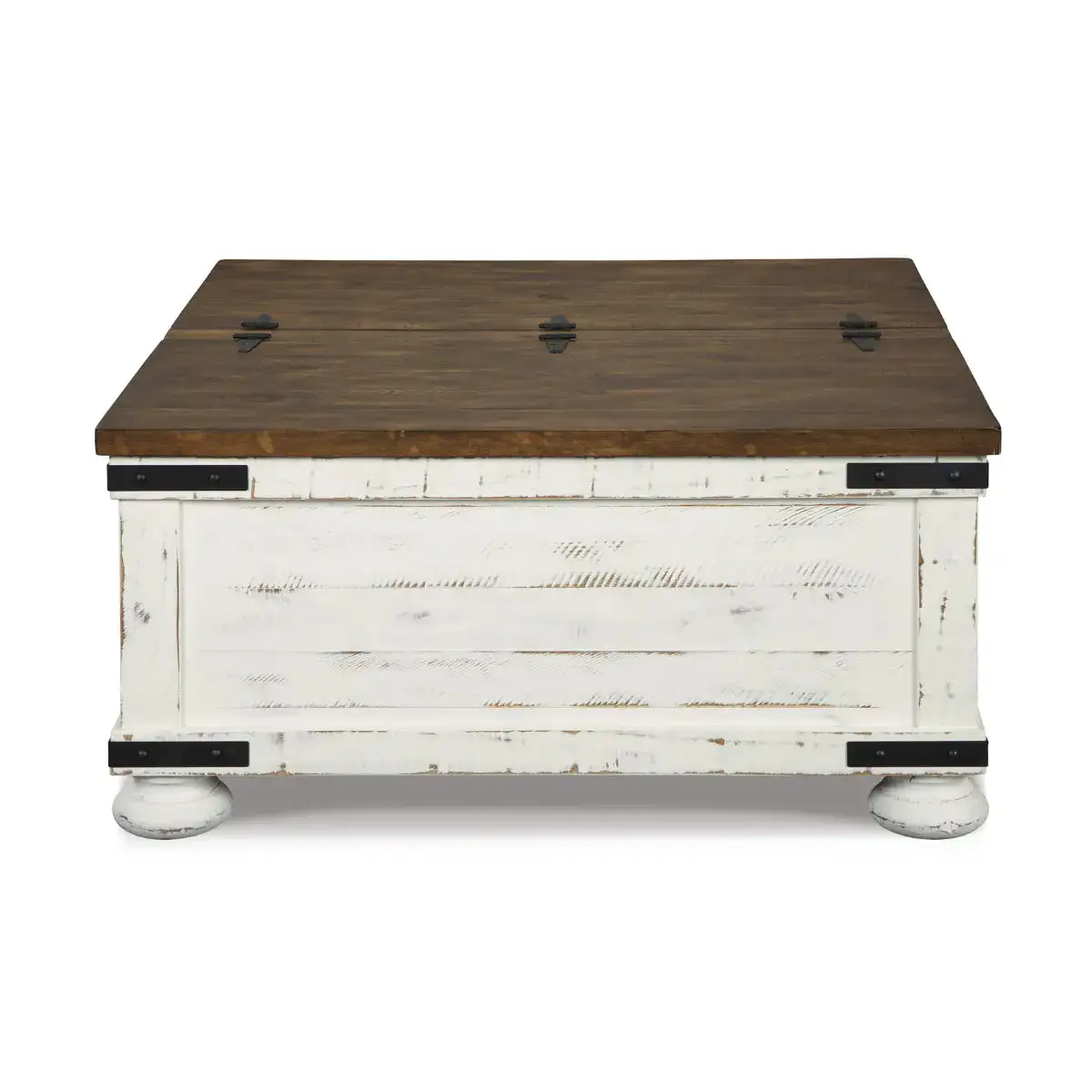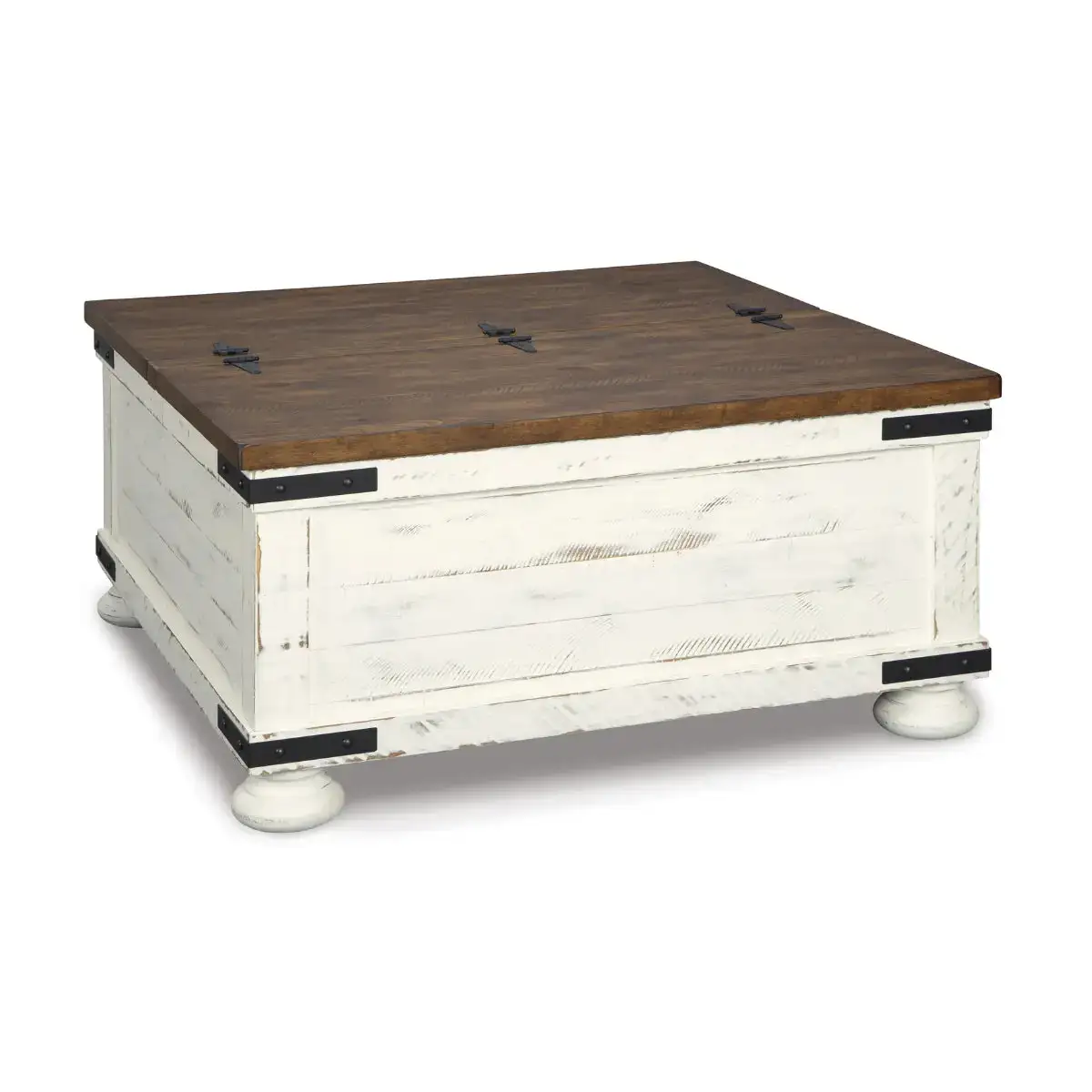 Double take. Sporting a two-tone finish, dual-sided lid design and expansive storage space, this square coffee table takes the art of rustic farmhouse living to a new level. Designer touches include plank-effect styling, heavy distressing and industrial bracket hardware.