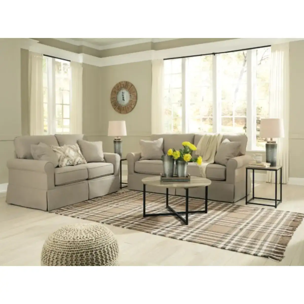 - Includes round coffee table and 2 square end tables